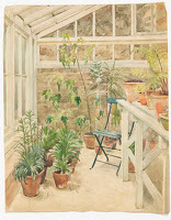 It's difficult to gauge the 'feel' of the interior of The Cedars from Evelyn's brush or pencil. She was never very interested in interiors. The people in them, yes, certainly, but rarely do we have an interior for its own sake. Our closest glimpse inside The Cedars comes perhaps in A Knitting Party, a 1940 painting for the War Artists' Advisory Committee, and even then Evelyn has enlarged the room with non-existent walls and bays in order to cram all the knitters in without jeopardising the balance of the painting.